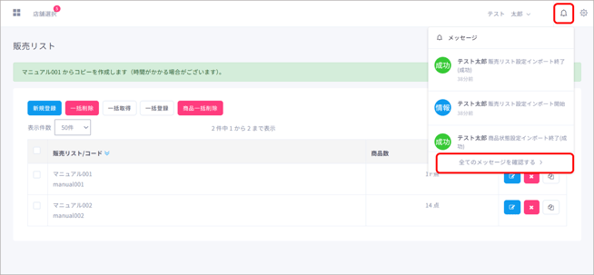 メッセージを確認するには、画面右上の「メッセージ」ボタンをクリックし、「全てのメッセージを確認する」をクリックして下さい。