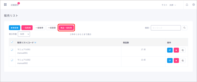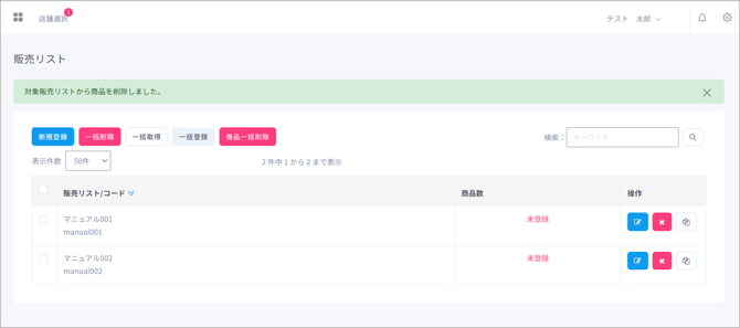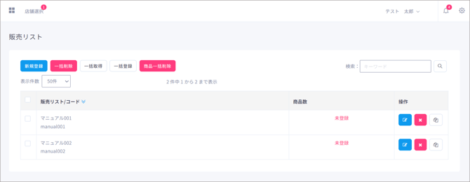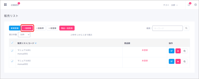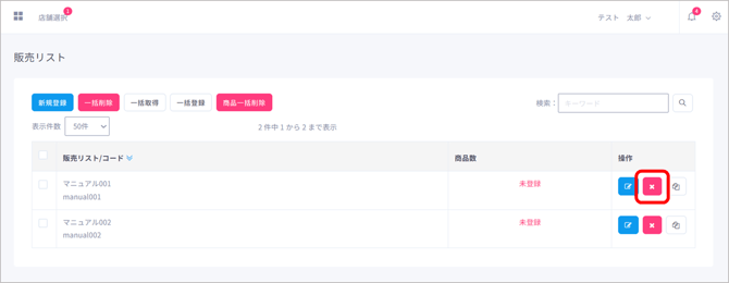販売リストを削除する際は、操作欄にある「削除」ボタンをクリックします。