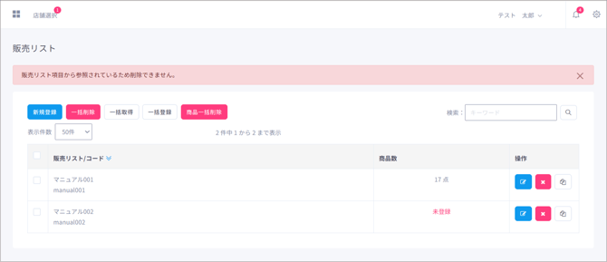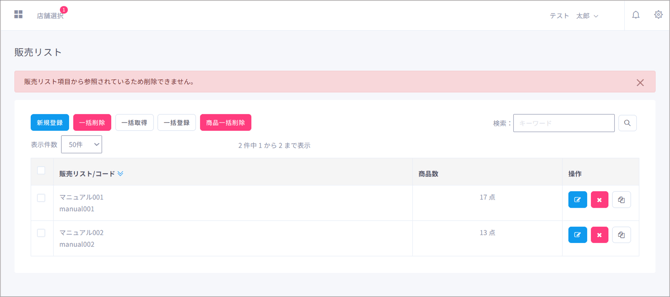 商品が登録されている販売リストは削除を行うことができません。