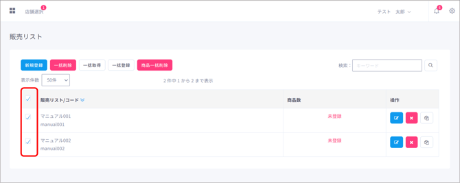 複数の販売リストで、登録された商品を括で削除する際は、削除したい販売リストのチェックボックスにチェックを入れます。