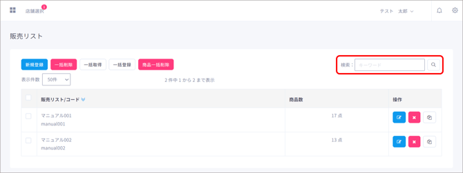 検索ワードは「販売リスト名」「販売リストコード」を入力することができます。