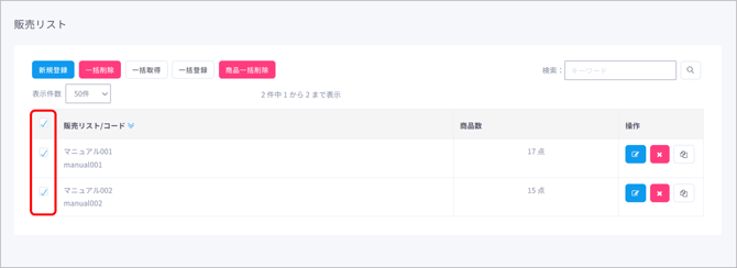 複数の販売リストを一括で削除する際は、削除したい販売リストのチェックボックスにチェックを入れます。