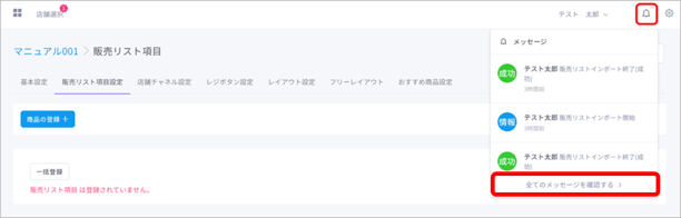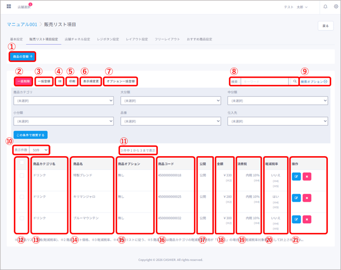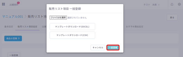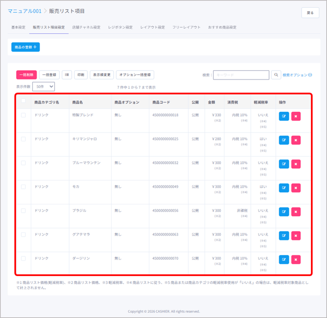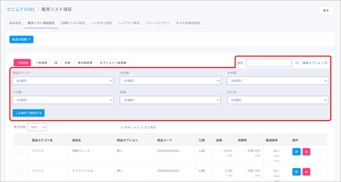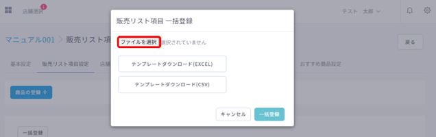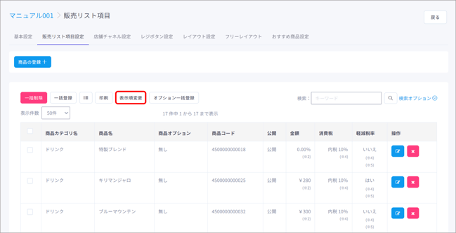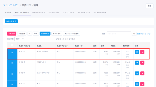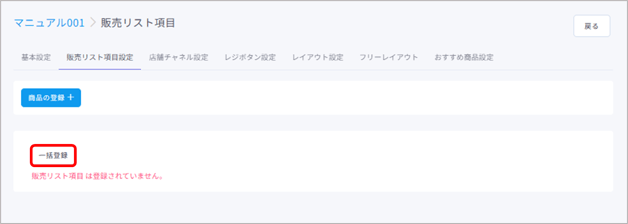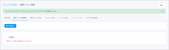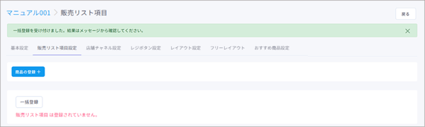 販売リスト項目(=商品)の割当や編集、一括登録や削除など、販売リスト項目(=商品)のマスタ管理ができます。