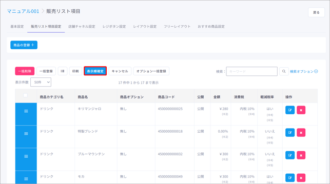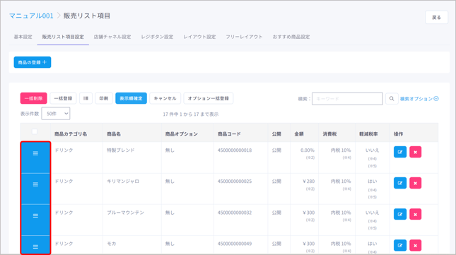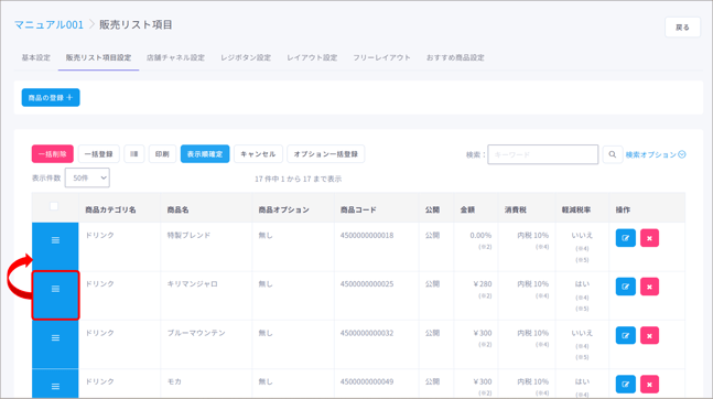販売リストに登録した商品の表示順の変更を行う際に使用します。