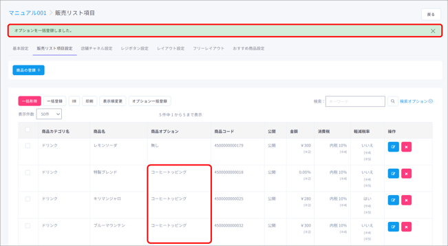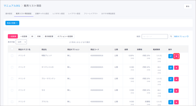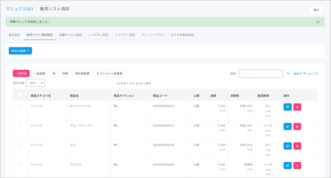 削除ボタンをクリックすると、その商品を販売リストから削除することができます。