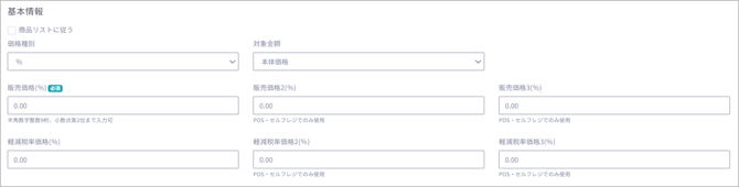 価格種別が【%】の場合、対象金額に設定した値が表示されます。