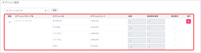オプショングループ、オプション名が表示されます。