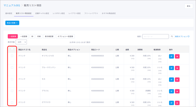 販売リストから複数の商品を削除する際は、その商品のチェックボックスにチェックを入れます。