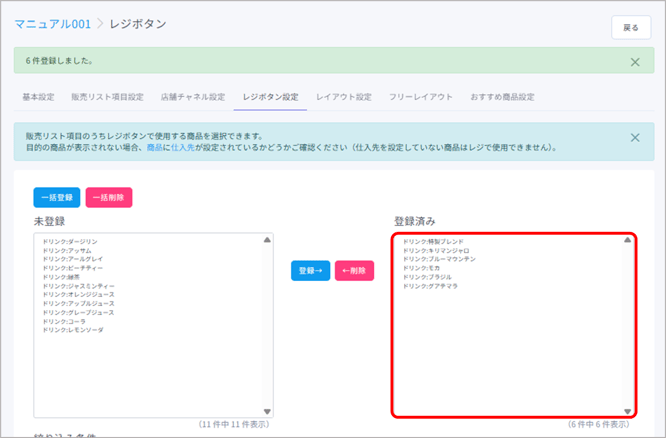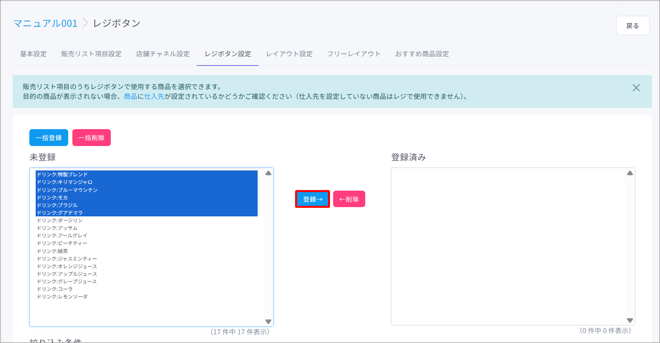 未登録から商品を選択し、【登録→】ボタンをクリックすると登録済みへ商品が移動します。