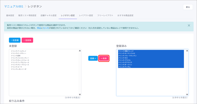 登録済みから商品を選択し、【←削除】ボタンをクリックすると、未登録へ商品が移動します。