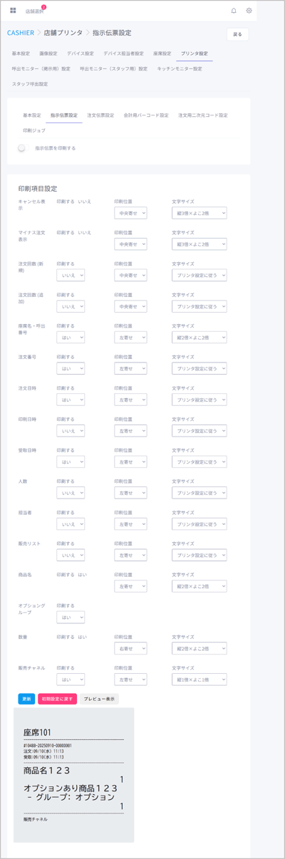 指示伝票に印刷することができる項目の印刷する/しない、印刷する場所の印刷位置、印刷する場合の文字サイズを設定することができます。