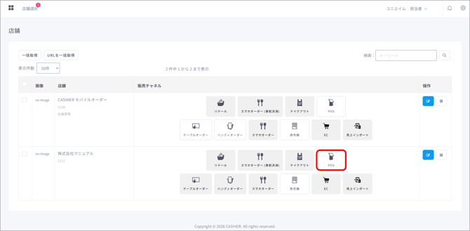 ③設定を行いたい店舗の販売チャネル欄にある「POS」をクリックします。