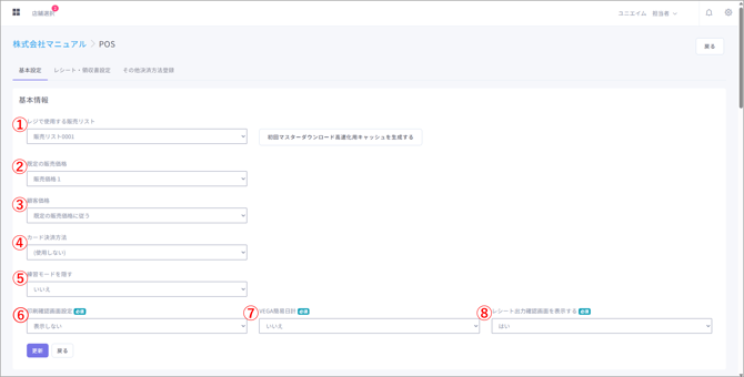 青背景の項目はPOS上で変更ができ、白背景のものはPOS上で変更不可となります。
