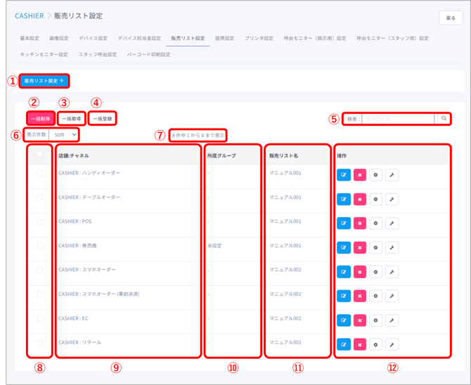 ⑧【チェックボックス】にチェックを入れた店舗チャネルの削除する際に使用します。