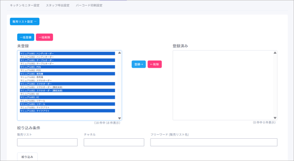 登録済みから販売リスト・チャネルを選択し、【←削除】ボタンをクリックすると、未登録へが移動します。