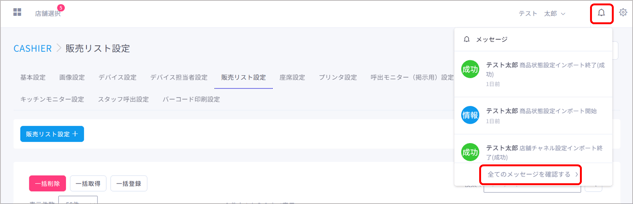 メッセージを確認するには、画面右上の「メッセージ」ボタンをクリックし、「全てのメッセージを確認する」をクリックして下さい。