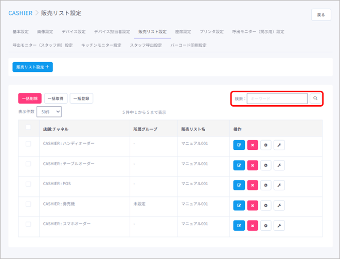 キーワードは「販売リスト名」のみ検索可能です。