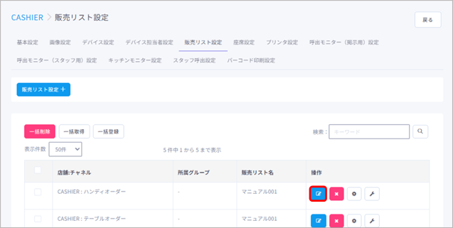 販売リストを設定したい店舗の【編集】ボタンをクリックします。