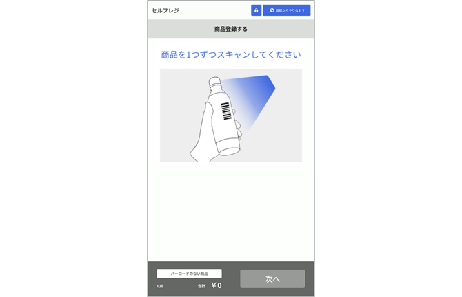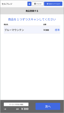 再度バーコードのない商品をカートに入れる際は、「バーコードのない商品」ボタンをタップし、カートに商品を追加して下さい。