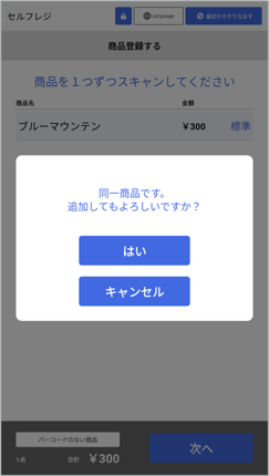 同じバーコードを連続して読み込んだ場合、確認画面が表示されます。